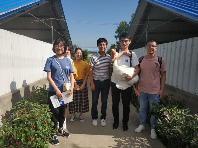 第一个实地学习地方的是白鹅养殖基地——安徽省展羽农业开发有限公司。该公司包含了从白鹅的孵化、养殖到即将建成的屠宰整个一条链的产业工序流程。在该公司理事长江卫军的陪同下,团队成员们一起参观了整个流程。除此之外,该公司在还在养殖场内部的河流和池塘种植水葫芦,用来净化水源,降低污染,而水葫芦反过来可以用作白鹅的饲料,产生更大的效益。参观之后,江卫军与团队进行的交流,解答疑惑,让成员们对整个养殖流程和基地有了更深刻的认识。