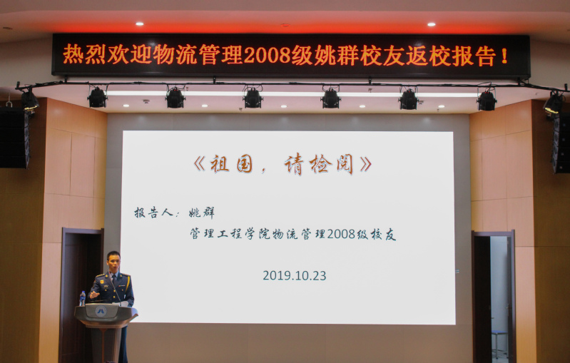 1023日下午,校武装部、校团委、管理工程学院在C7报告厅举办校友专场报告会,邀请我校管理工程学院物流管理2008级校友姚群,与师生共同分享他参加新中国成立70周年阅兵仪式的经历。