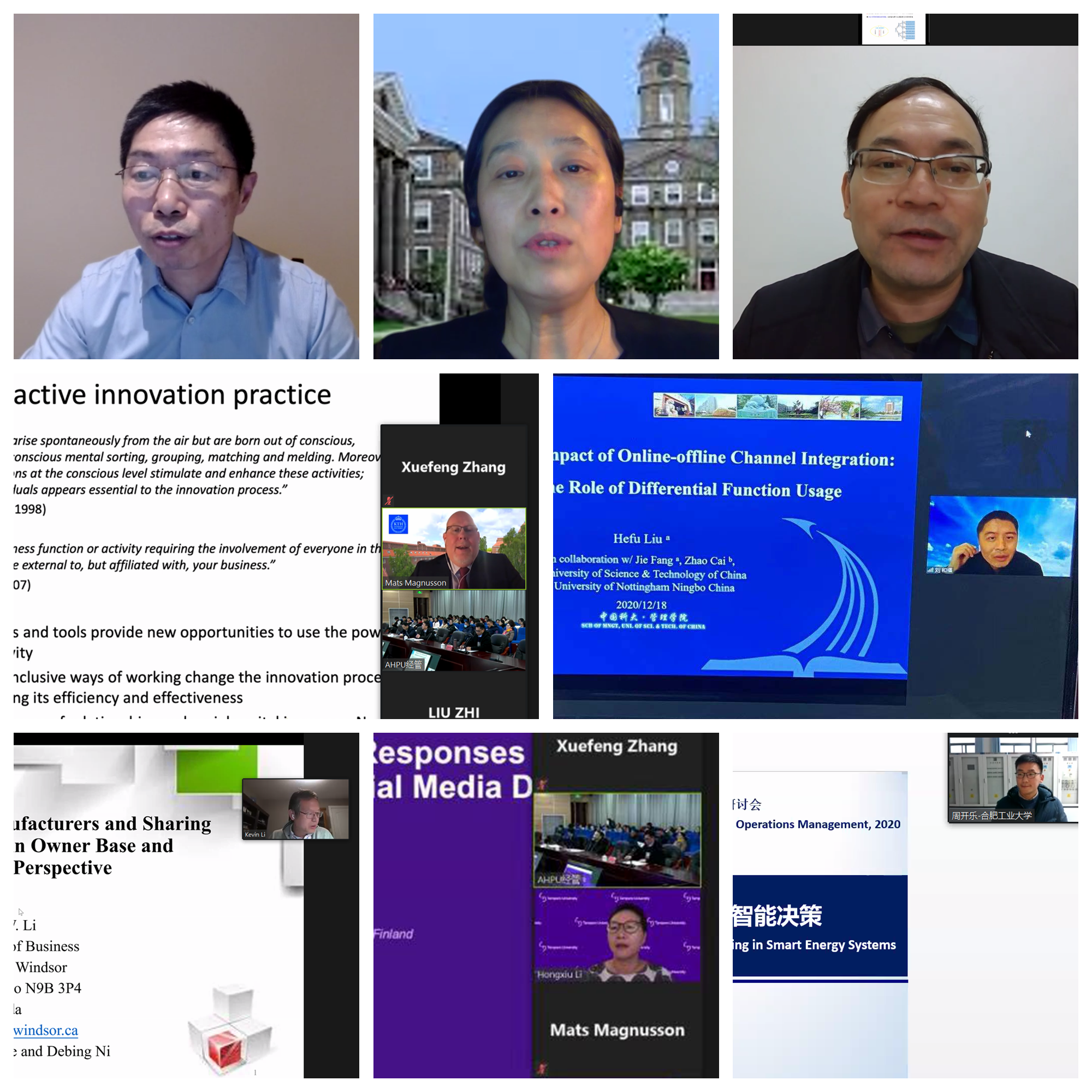 本次研讨会由八位国内外知名专家的报告会组成。加拿大滑铁卢大学Qi-Ming He教授作《Optimal policies for stochastic clearing systems with time-dependent delay penalties》的学术报告,讨论一个具有离散时间马尔科夫输入过程的随机清除系统,以及一种间歇和瞬时清除系统部分或全部的输出机制,首次提出了求解此类复杂清算系统最优策略参数的有效算法。电子科技大学李登峰教授作《非合作-合作两型博弈融通方法》的学术报告,重点介绍了非合作-合作两型博弈融通方法的主要思想与原理、建模方法、求解方法等。加拿大达尔豪斯大学Jing Chen教授作《Optimal Decisions on Prices, Order Quantities, and Returns Policies in a Supply Chain with Two-period Selling》的学术报告,主要分析了零售商销售季节性产品的供应链中的客户退货政策,定价和订购决策。加拿大温莎大学Kevin W. Li教授作了《Competition between Manufacturers and Sharing Economy Platforms: An Owner Base and Sharing Utility》的学术报告,研究构建一个具有共享效用的两周期博弈模型来分析制造商如何与共享经济平台竞争,从长期和短期角度来共享制造商的产品。瑞典皇家工学院Mats Magnusson教授作了《Peer interaction and collective innovation performance》的学术报告,主要介绍了通过对集体创新的不同研究,分析同伴关系和同伴互动对创新绩效的影响,得出了对创新研究和实践的启示。芬兰坦佩雷大学Hongxiu Li副教授作了《Understanding Consumers’ Responses to Service Robots through Social Media Data》的学术报告,主要通过将机器人的可爱性作为服务机器人的拟人化属性,并将信息系统(IS)的两个主要属性作为顾客反应的预测因子,量化它们在酒店服务环境中各自对顾客满意度和愉悦度的影响。中国科学技术大学刘和福教授作了《Understanding the impact of online-offline channel integration: considering the moderating role of differential function usage strategy》的学术报告,研究收集了248家同时在中国两大电子商务平台开设旗舰店的在线零售商的数据,运用倾向得分匹配和多层次线性模型,识别零售商差异功能使用策略在多平台中的重要作用。合肥工业大学周开乐教授作了《智慧能源系统协同优化与智能决策》的学术报告,主要介绍智慧能源系统中的能源供给体系、服务理念与服务模式的创新,智慧能源系统供需资源的协同优化与智能决策系统。八场专家报告会分别由经济与管理学院副院长蔡书凯教授、副院长谢荣见教授,副教授刘志博士、副教授李小东博士主持。