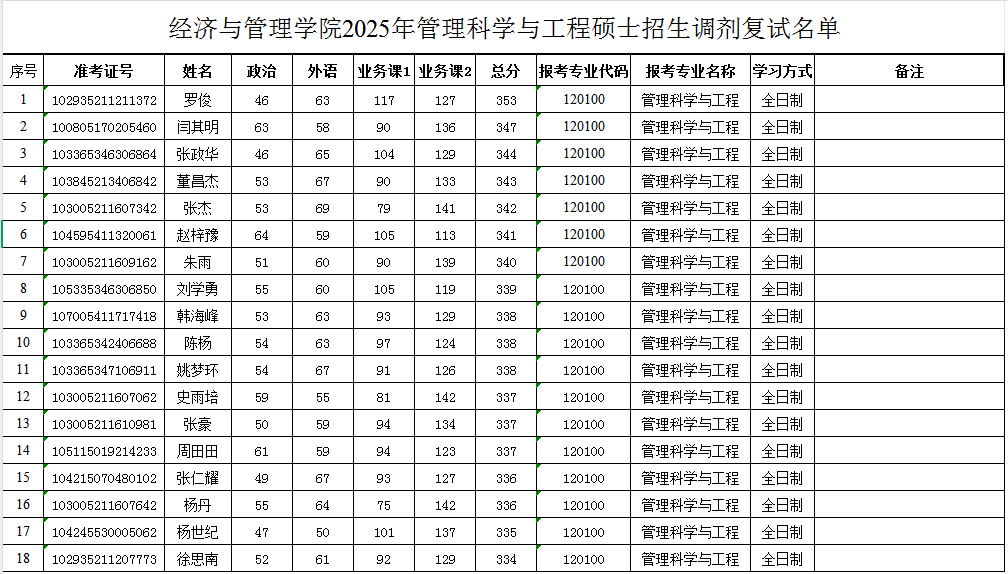 经济与管理学院2025年管理科学与工程硕士招生调剂复试名单