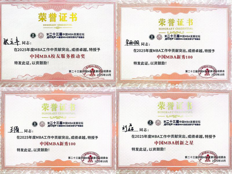 在晚间举行的第二十三届中国MBA发展论坛2025年度颁奖典礼环节,我校MBA教育中心受到中国MBA发展论坛组委会专家们的高度认可并被授予多项荣誉。其中,我MBA联合会被授予“2025年度中国MBA最佳组织奖,MBA教育中心主任张云丰荣获中国MBA校友服务推动奖,23级学员宋雨桐、24级学员王倩入选中国MBA新秀100,25级学员刘磊夺得中国MBA创新之星”荣誉称号。