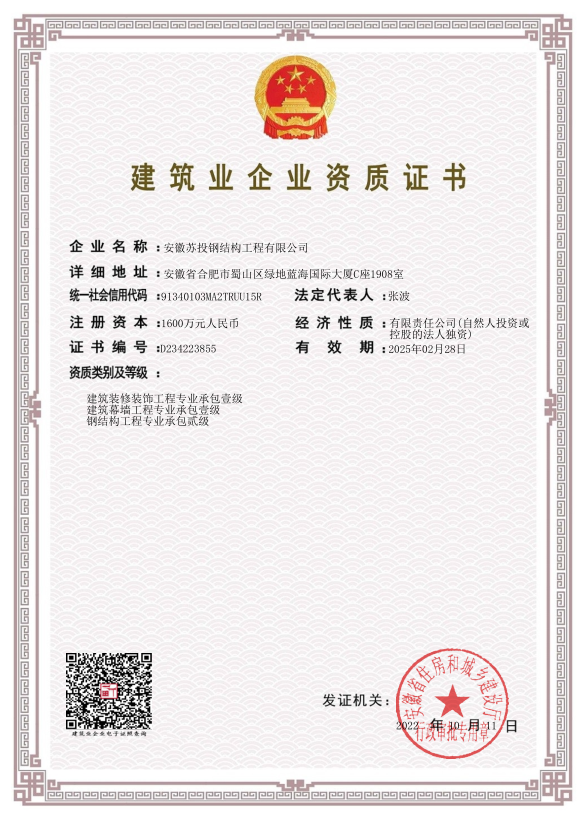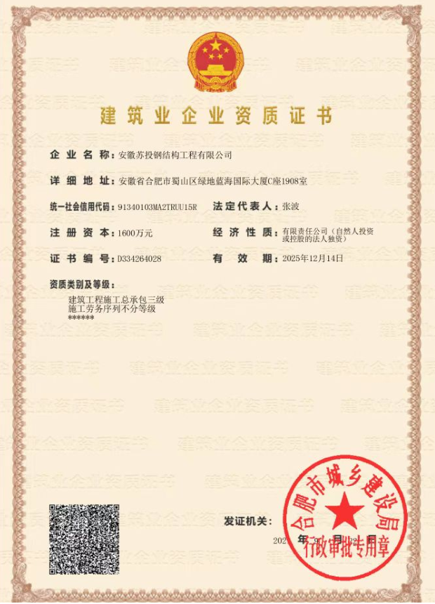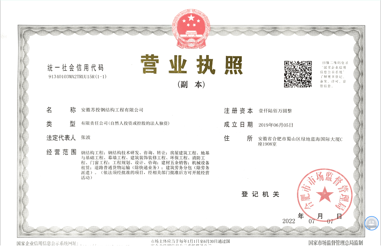 安徽苏投钢结构工程有限公司成立于2019年,注册地址:安徽省合肥市蜀山区绿地蓝海国际大厦C座1908室。由北上广深工作经验的专业工程人员创建,是安徽省唯一一家专业从事复杂异性空间钢结构、预应力钢结构技术研发及施工的专业钢结构公司,与中国建筑科学研究院、东南大学、同济大学等高校和科研院所保持长期的产学研合作。公司管理人员全部人证合一,持证上岗,技术实力强,专业素养高。秉承“持专业态度、用专业人、做专业事”的信念,持续为客户创造最大价值。公司自成立以来,市场认可度极高,发展速度迅猛,营收额逐年呈几何指数增长,目前年合同额已达5亿元左右。主要工程业绩有2019年长三角峰会主会场银湖桥梁工程、舒城体育中心、滁州奥体中心、贵阳轨道交通2号线车辆段、佰和佰乐大健康产业园、中德产业园、航空产业园、玖玖广场预应力张悬梁屋盖等一批重点难点项目,长期与中建、中铁等央企保持良好的战略合作。