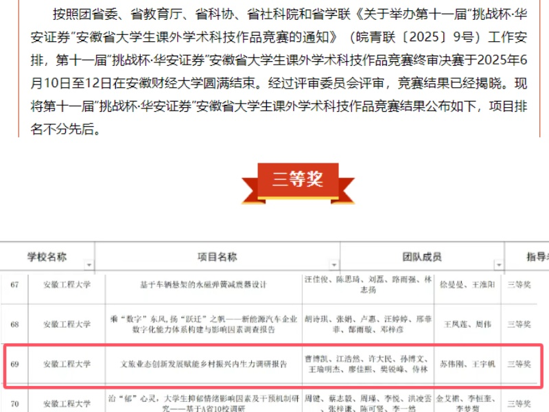 6月16日,安徽学联公众号公布了第十一届“挑战杯·华安证券”安徽省大学生课外学术科技作品竞赛结果,建筑工程学院土木233班曹博凯等8位同学的作品《文旅业态创新发展赋能乡村振兴内生力调研报告》荣获三等奖,指导教师苏伟刚、王宇帆,实现目前我院在“挑战杯”赛事中的最好成绩。第十一届“挑战杯·华安证券”安徽省大学生课外学术科技作品竞赛是由共青团安徽省委员会、安徽省教育厅、安徽省人力资源和社会保障厅、安徽省科学技术协会和安徽省学生联合会等单位共同主办的赛事,终审决赛于2025年6月10日至12日在安徽财经大学圆满结束。