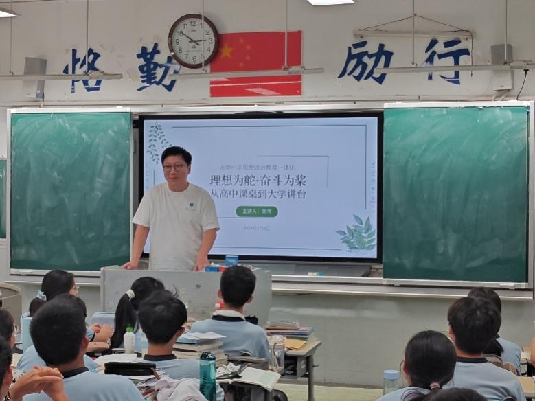 7月8日,为推进学院“大中小学思想政治教育一体化”建设,土木工程系主任黄博回到高中母校蚌埠二中开展了“名师进中学活动”,建筑学专业2025届毕业生陆彦博一同返回母校参加此次活动。