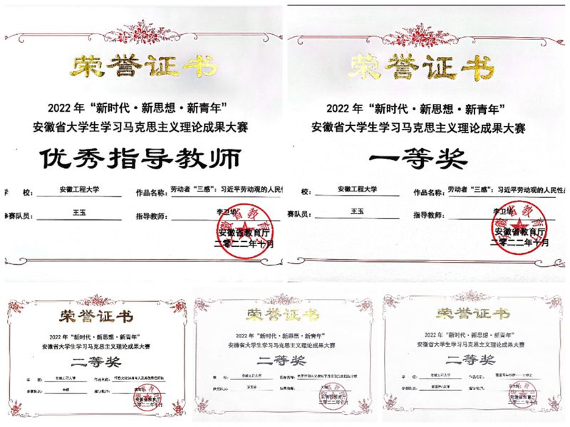 近日,安徽省教育厅公布2022年“新时代•新思想•新青年”安徽省大学生学习马克思主义理论成果大赛评审结果,全省共评出一等奖23个、二等奖49个、三等奖66个,共计138件作品获奖。我校马克思主义学院研究生王玉、廖玉林、李媛、余洋四名同学分别获得一等奖1项、二等奖3项的好成绩。李卫华老师获得优秀指导教师奖。