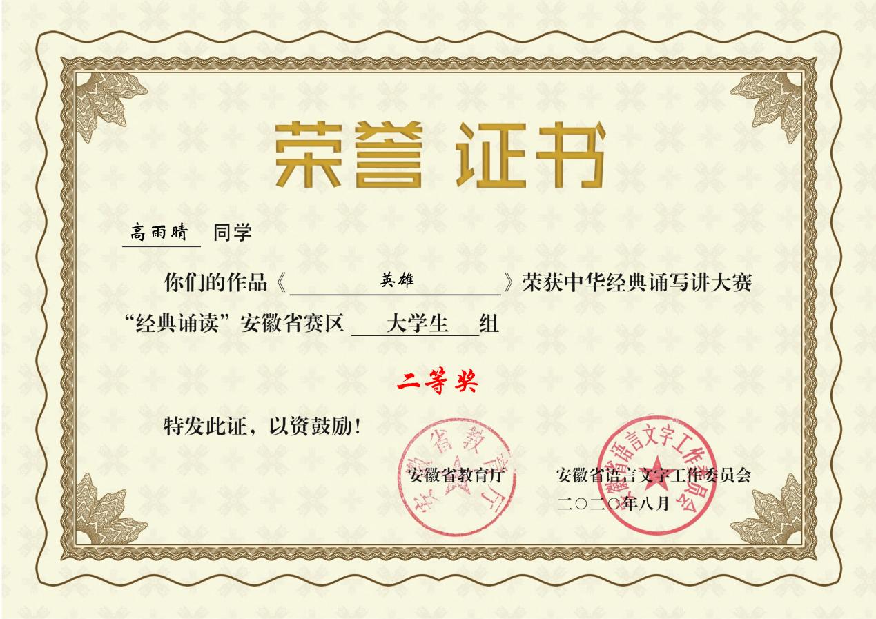 中华经典诵写讲大赛“经典诵读”安徽省赛区大学生组二等奖
