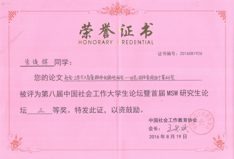 2016年朱瑛辉获第八届中国社会工作大学生论坛暨首届MSW研究生论坛三等奖