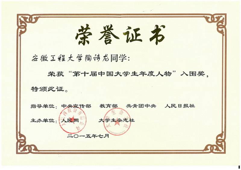 陶诗龙入围2015年第十届“中国大学生年度人物”