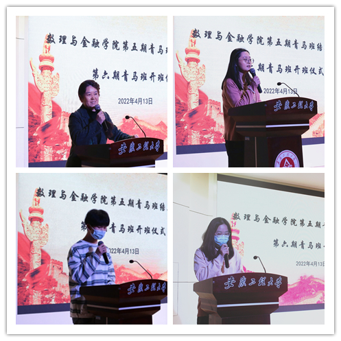 典礼结束后,数理与金融学院“青马工程”团学骨干培训班召开了第六期的第一次班会,对学员要求、管理方式、课程设置做了介绍;强调培训课程涵盖理论学习、志愿实践、特色活动等,将用一年的培训时间来树典型、育模范,带动学院整体青年风气积极向上。