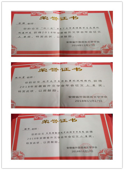 1116-18日,由安徽省外国语言文学学会主办、安徽师范大学外国语学院承办、外语教学与研究出版社协办的“安徽省外国语言文学学会2018年年会”在安徽师范大学隆重举行。来自全省本科、高职高专院校的200余名外语界专家学者、教师代表出席了本次盛会。我校外国语学院副院长黄焰结教授带领8位教师人参加了本次年会的学习交流和研讨活动。