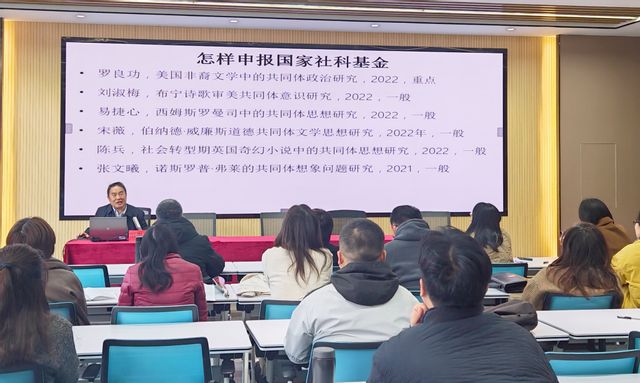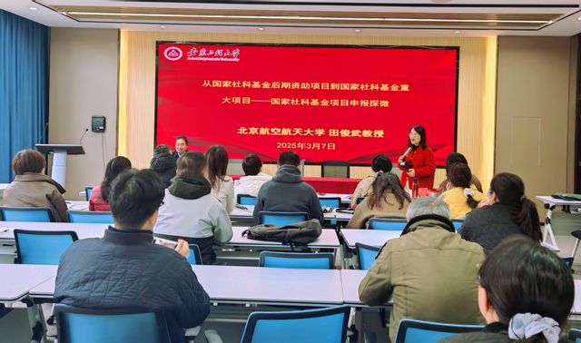 报告会上,田俊武教授从文学经典出发,借古喻今,讲述了国家社科基金的重要性。,接着,从国家社科基金的选题研判、跨学科视野的培养、学术风向标的研究以及申报流程的全关注等多方面详细阐述了国家社科基金的申报技巧,指出申报重大项目要善于“前期冲锋,中期夺标,后期殿后”,并倡导教师要将国家社科基金申报工作作为开展科学研究的工作日常工作。